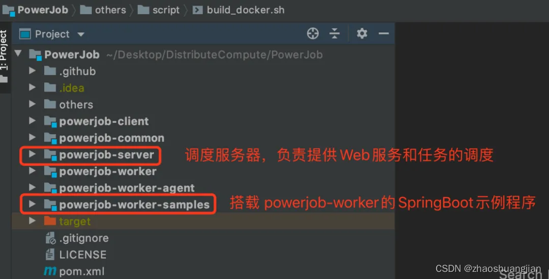 导入 IDE,源码结构如下,我们需要启动调度服务器(powerjob-server),同时在samples工程中编写自己的处理器代码