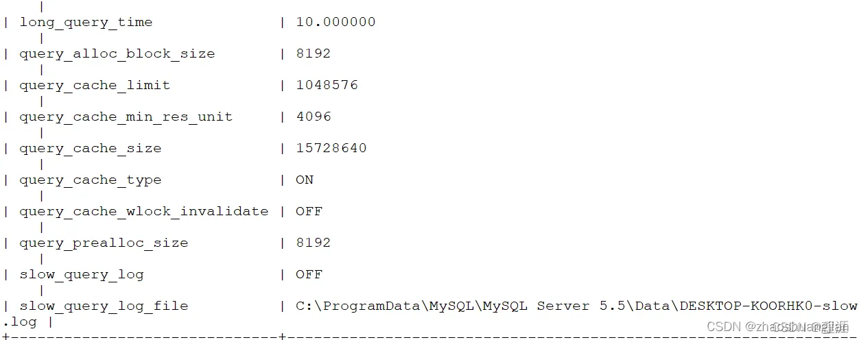 可以看到slow_query_log的值是OFF,也就是mysql默认是不启用慢查询日志的。