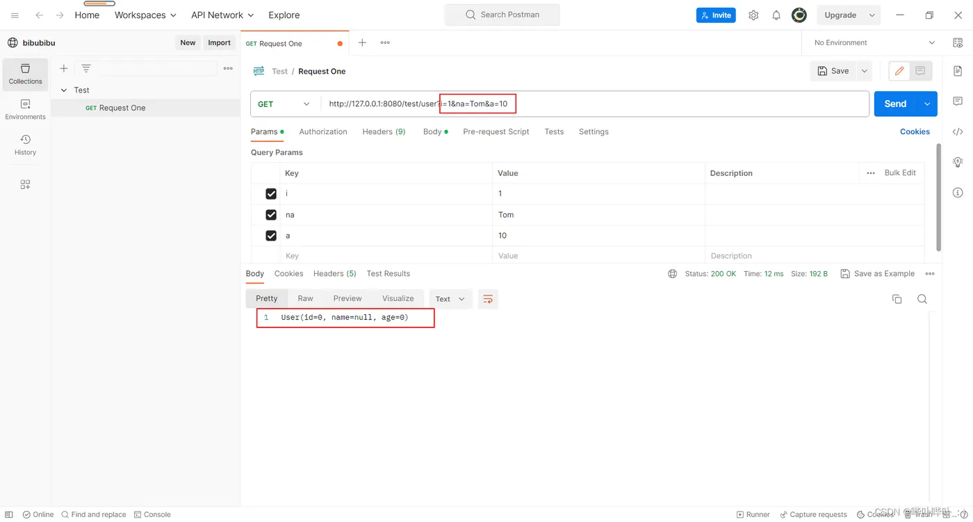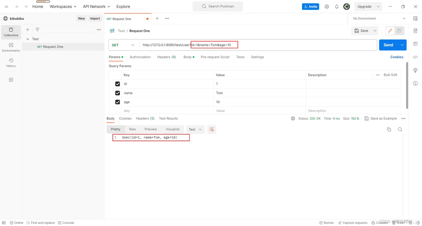 @RestController @RequestMapping("/test") public class TestController { // 传递对象 @GetMapping("/user") public String showUser(User user) { return user.toString(); } }