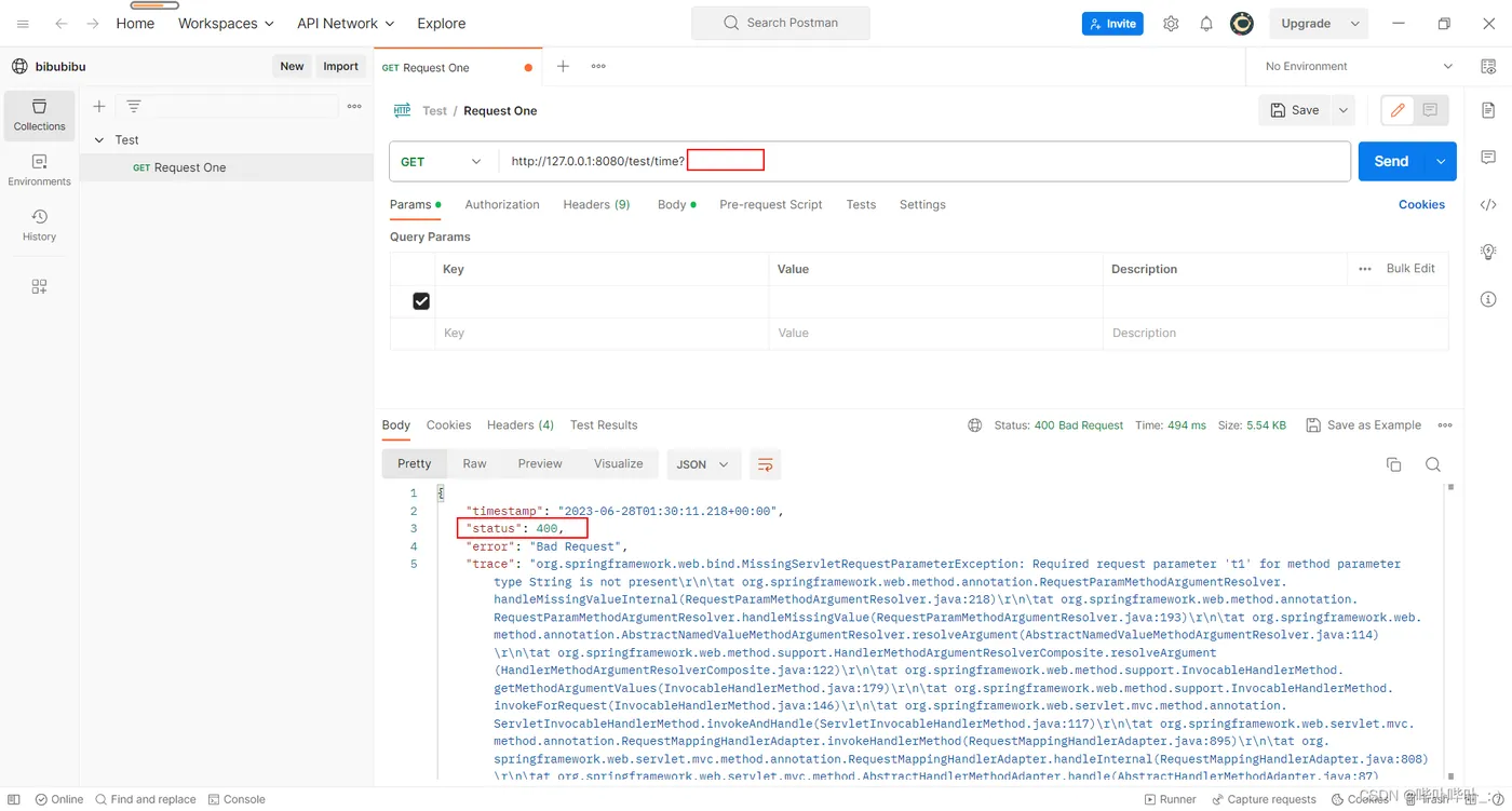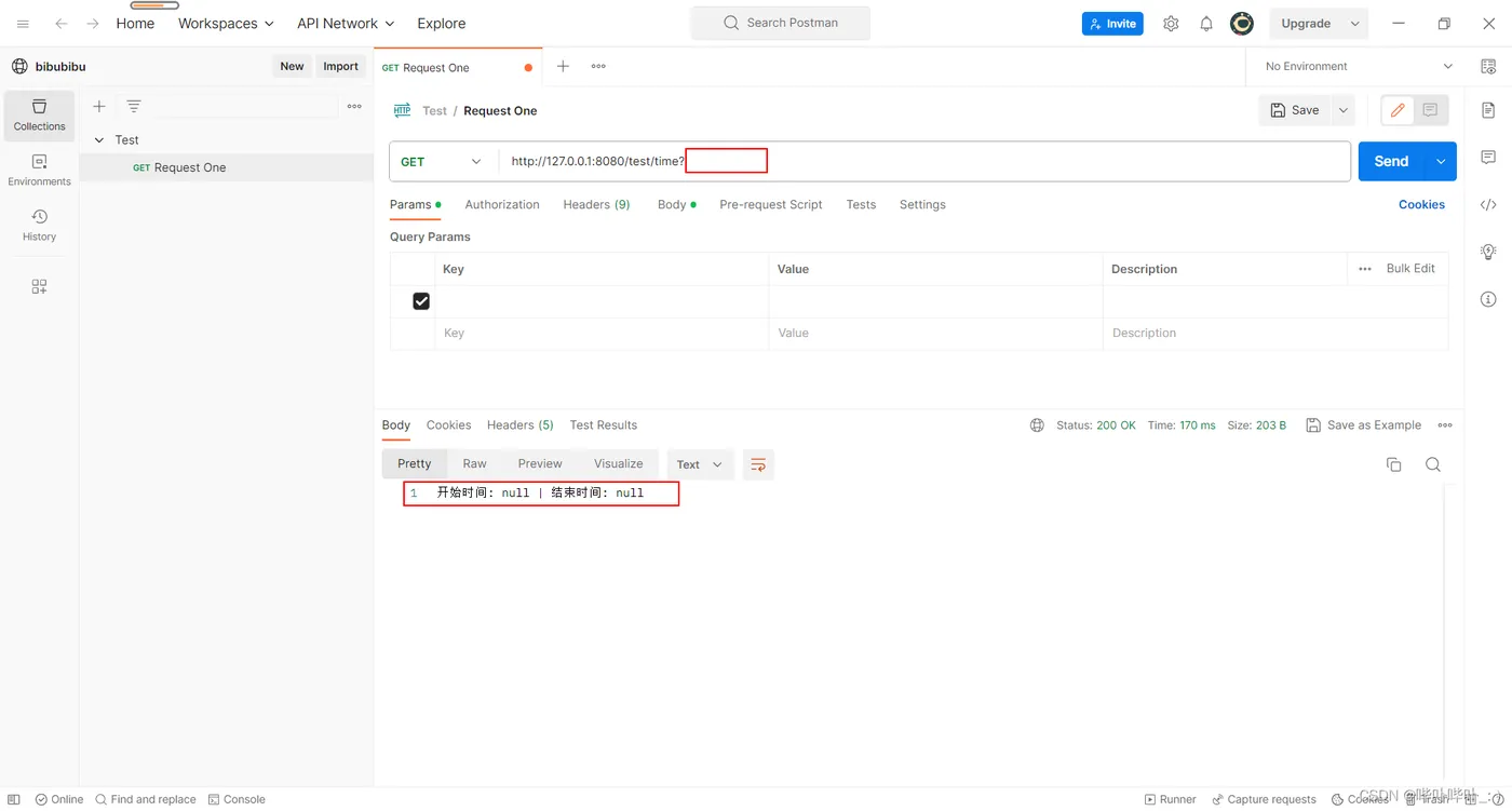 @GetMapping("time") public String showTime( @RequestParam(value = "t1", required = false) String startTime, @RequestParam(value = "t2", required = false) String endTime) { return "开始时间: " + startTime + " | 结束时间: " + endTime; }