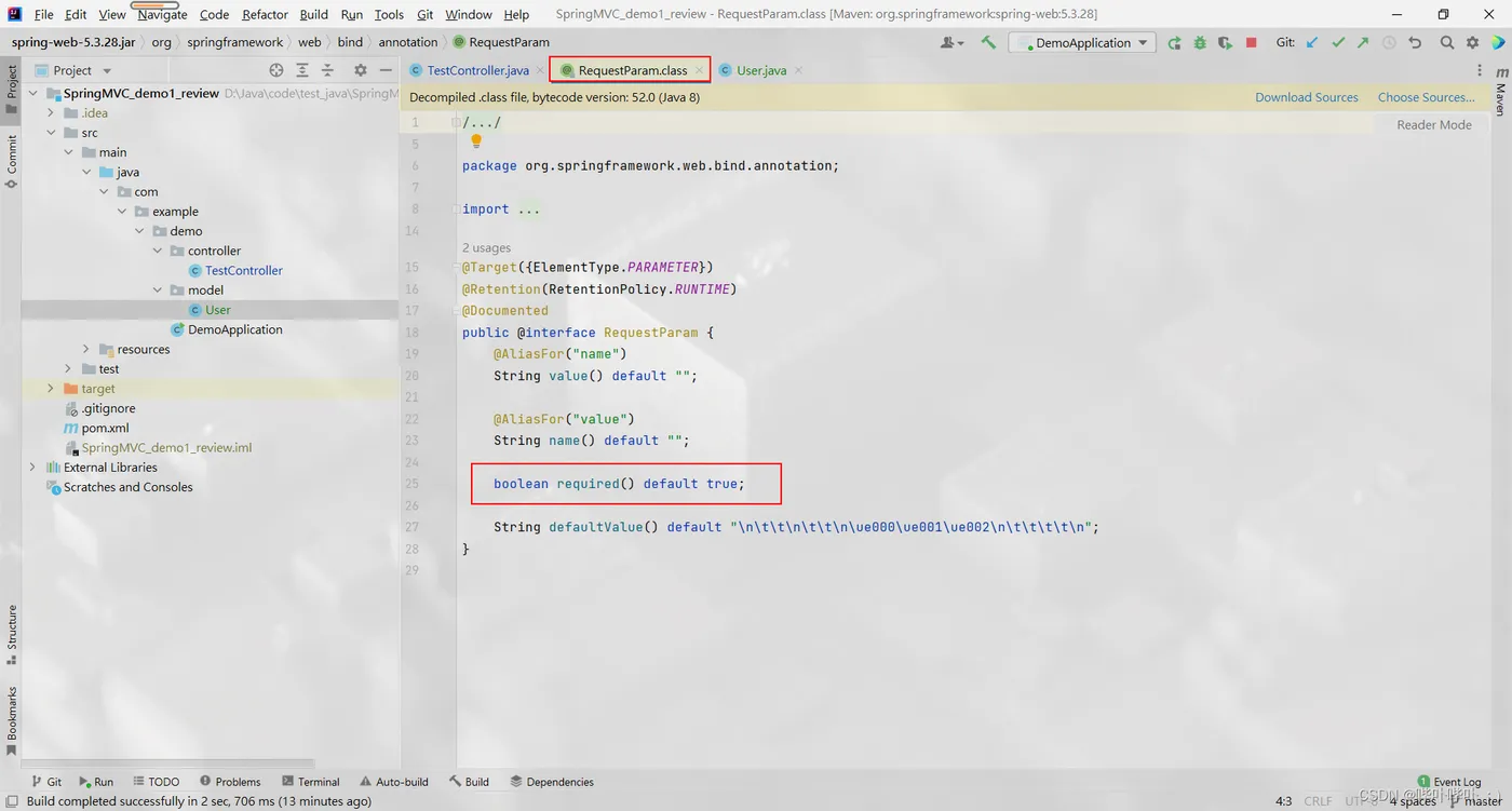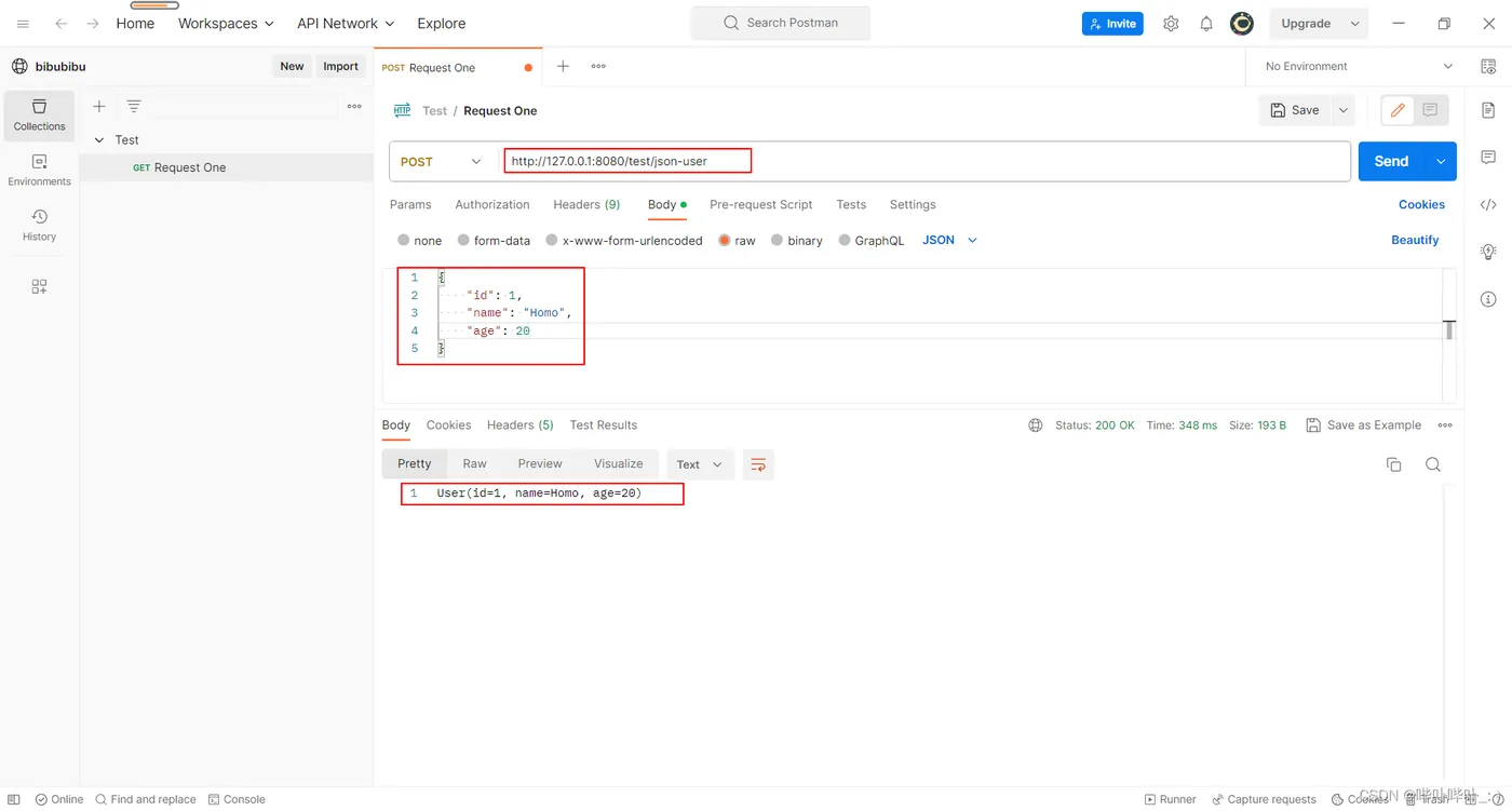 @RestController @RequestMapping("/test") public class TestController { // 传递 JSON 对象 @PostMapping("/json-user") // 推荐使用 @PostMapping public String showJsonUser(@RequestBody(required = false) User user) { return user.toString(); } }