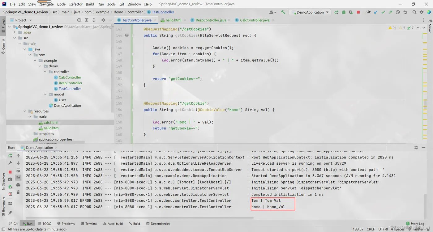 @RestController @RequestMapping("/test") @Slf4j public class TestController { @RequestMapping("/getCookies") public String getCookies(HttpServletRequest req) { Cookie[] cookies = req.getCookies(); for(Cookie item : cookies) { log.error(item.getName() + " | " + item.getValue()); } return "getCookies~~"; } }