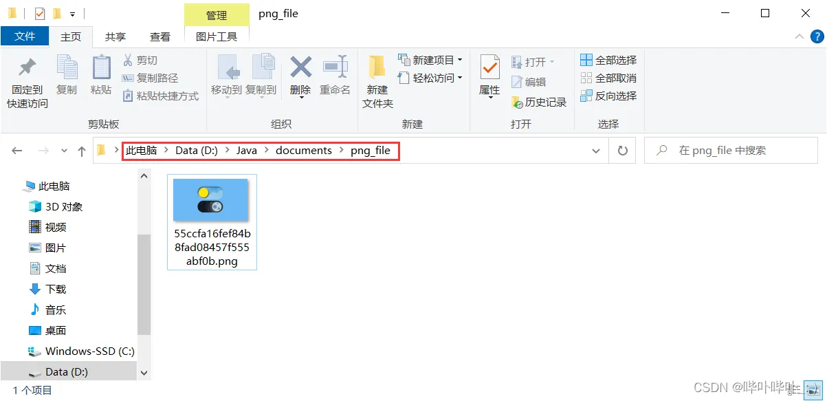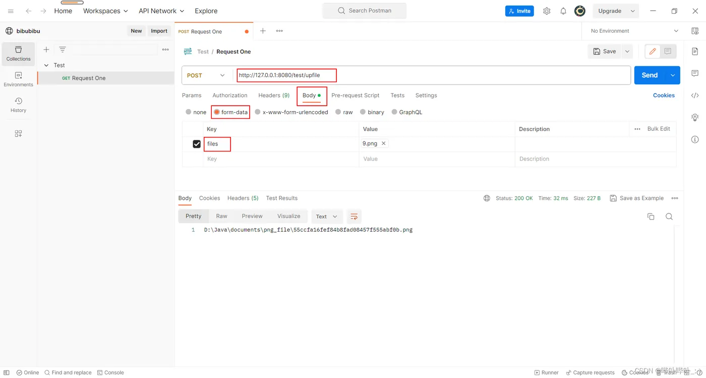 @RestController @RequestMapping("/test") public class TestController { // 上传文件 @RequestMapping("/upfile") public String upFile(@RequestPart("files") MultipartFile file) throws IOException { // 1. 根目录 String path = "D:\\Java\\documents\\png_file\\"; // 2. 根目录 + 唯一文件名 path += UUID.randomUUID().toString().replace("-", ""); // 3. 根目录 + 唯一文件名 + 文件后缀 path += file.getOriginalFilename().substring(file.getOriginalFilename().lastIndexOf(".")); // 4. 保存文件 file.transferTo(new File(path)); return path; } }