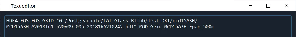 其第二个元素包含了该波段对应的数据行数与列数(即[2400×2400])、数据名称(即Fpar)、数据空间分辨率(即500m)、数据产品简称(即MOD_Grid_MCD15A3H),以及数据格式(即8-bit unsigned integer);而第一个字符串没有显示完毕,我们可以点击打开看看: