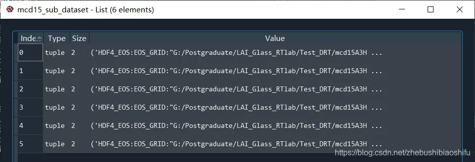 因为我们读取的HDF文件是多波段,因此hdf_band_num肯定是大于1的,那么刚刚读取进来的mcd_sub_dataset其实就是一个列表(List);其中,这个列表的元素个数就是对应的多波段HDF文件波段数,列表的每一个元素则都是一个元组(tuple);同时,每一个元组都有两个元素,其每一个元素都是一个字符串;其中第一个元素为当前HDF文件的当前波段对应的文件路径与部分提示信息,第二个元素作为当前HDF文件的当前波段对应的文件像素行列数、名称与数据类型。