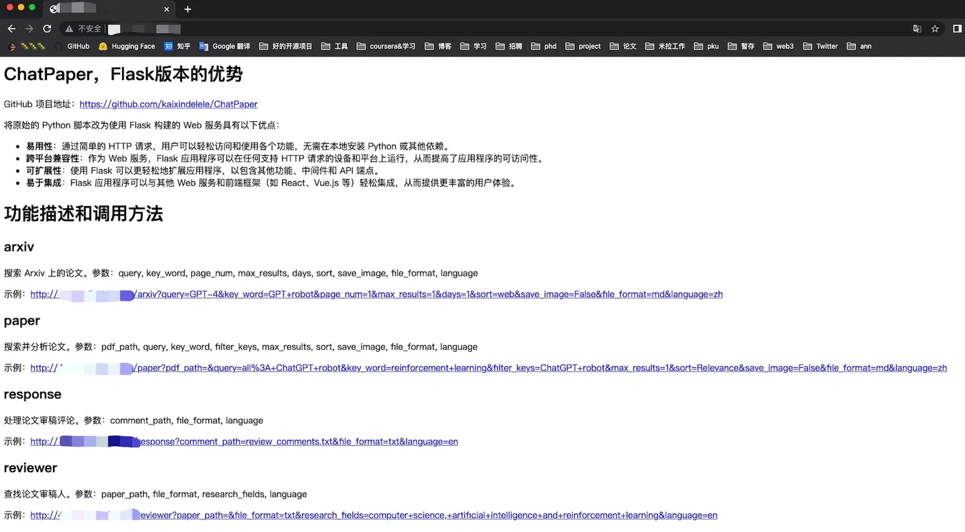 特别的,这四个接口实际是封装了根目录下四个脚本的 web 界面。参数可以通过链接来修改。例如要运行“arxiv?query=GPT-4&key_word=GPT+robot&page_num=1&max_results=1&days=1&sort=web&save_image=False&file_format=md&language=zh”的话,相当于在根目录下调用 chat_arxiv.py 并返回结果。这个显示的结果和在命令行中调用的结果是一样的(即:python chat_arxiv.py --query "GPT-4" --key_word "GPT robot" --page_num 1 --max_results 1 --days 1 --sort "web" --save_image False --file_format "md" --language "zh")。您可以通过修改参数来获得其他搜索结果。