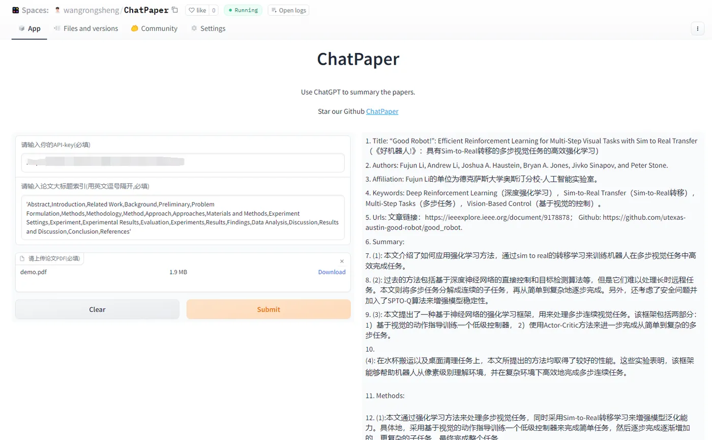 ChatPaper | 通过ChatGPT实现对论文进行总结,帮助科研人进行论文初筛 | 访问wangrongsheng/ChatPaper 使用 | -- | 原项目地址 |