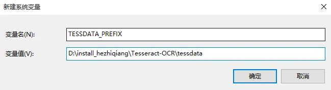 系统环境变量中,添加变量“ TESSDATA_PREFIX ”,变量值为“D:\install_hezhiqiang\Tesseract-OCR\tessdata ”,如下图