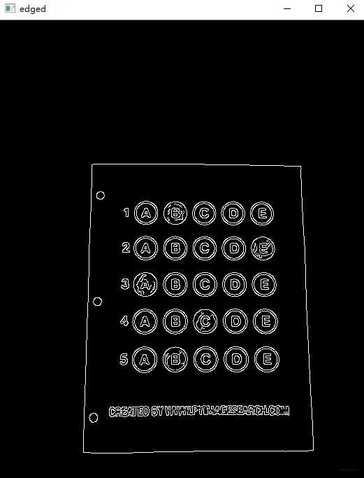 # 预处理 image = cv2.imread(args["image"]) contours_img = image.copy() gray = cv2.cvtColor(image, cv2.COLOR_BGR2GRAY) blurred = cv2.GaussianBlur(gray, (5, 5), 0) cv_show('blurred',blurred) edged = cv2.Canny(blurred, 75, 200) cv_show('edged',edged)