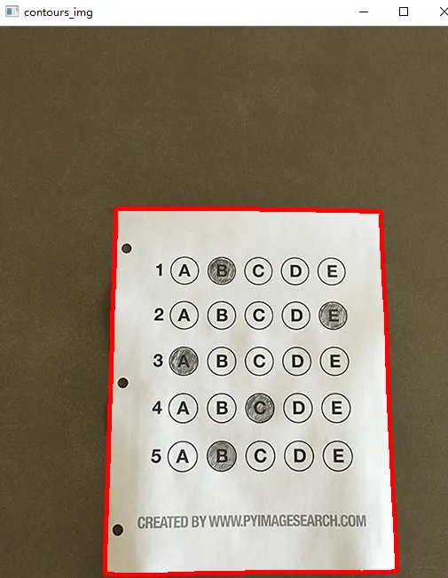 cnts = cv2.findContours(edged.copy(), cv2.RETR_EXTERNAL, cv2.CHAIN_APPROX_SIMPLE)[1] cv2.drawContours(contours_img,cnts,-1,(0,0,255),3) cv_show('contours_img',contours_img) docCnt = None