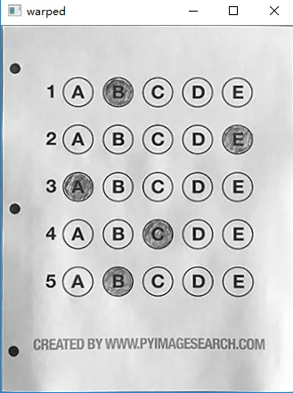 # 每排有5个选项 for (q, i) in enumerate(np.arange(0, len(questionCnts), 5)): # 排序 cnts = sort_contours(questionCnts[i:i + 5])[0] bubbled = None # 遍历每一个结果 for (j, c) in enumerate(cnts): # 使用mask来判断结果 mask = np.zeros(thresh.shape, dtype="uint8") cv2.drawContours(mask, [c], -1, 255, -1) #-1表示填充 cv_show('mask',mask) # 通过计算非零点数量来算是否选择这个答案 mask = cv2.bitwise_and(thresh, thresh, mask=mask) total = cv2.countNonZero(mask) # 通过阈值判断 if bubbled is None or total > bubbled[0]: bubbled = (total, j) # 对比正确答案 color = (0, 0, 255) k = ANSWER_KEY[q] # 判断正确 if k == bubbled[1]: color = (0, 255, 0) correct += 1 # 绘图 cv2.drawContours(warped, [cnts[k]], -1, color, 3)