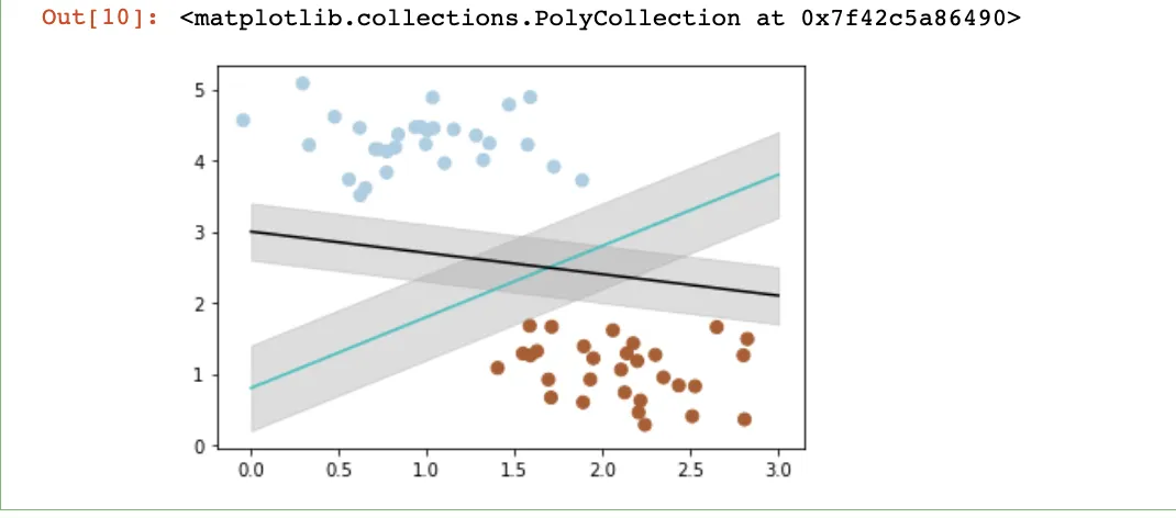 # 画散点图 X, y = make_blobs(n_samples=60, centers=2, random_state=0, cluster_std=0.4) plt.scatter(X[:, 0], X[:, 1], c=y, s=50, cmap=plt.cm.Paired) x_fit = np.linspace(0, 3) # 画函数 y_1 = 1 * x_fit + 0.8 plt.plot(x_fit, y_1, '-c') # 画边距 plt.fill_between(x_fit, y_1 - 0.6, y_1 + 0.6, edgecolor='none', color='#AAAAAA', alpha=0.4) y_2 = -0.3 * x_fit + 3 plt.plot(x_fit, y_2, '-k') plt.fill_between(x_fit, y_2 - 0.4, y_2 + 0.4, edgecolor='none', color='#AAAAAA', alpha=0.4)