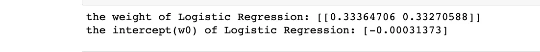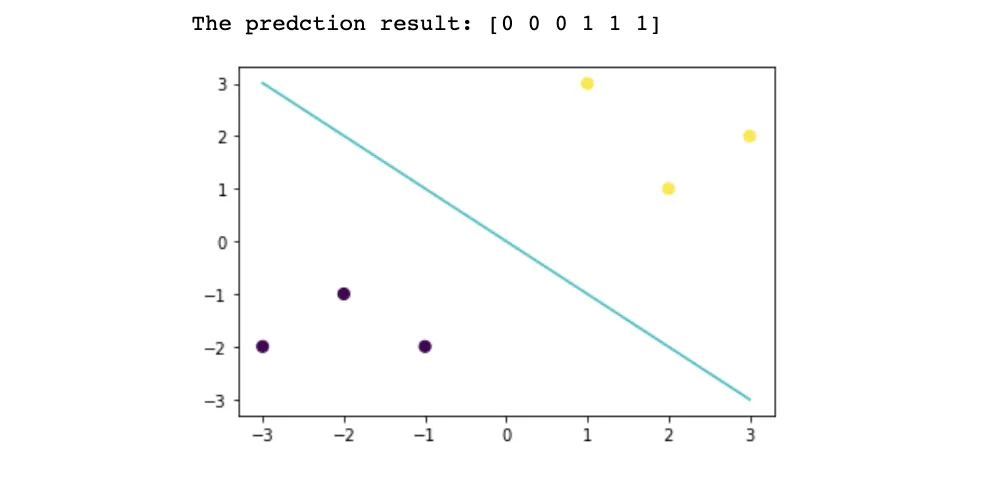 ## 构造数据集 x_fearures = np.array([[-1, -2], [-2, -1], [-3, -2], [1, 3], [2, 1], [3, 2]]) y_label = np.array([0, 0, 0, 1, 1, 1]) ## 调用SVC模型 (支持向量机分类) svc = svm.SVC(kernel='linear') ## 用SVM模型拟合构造的数据集 svc = svc.fit(x_fearures, y_label) ## 查看其对应模型的w print('the weight of Logistic Regression:',svc.coef_) ## 查看其对应模型的w0 print('the intercept(w0) of Logistic Regression:',svc.intercept_)