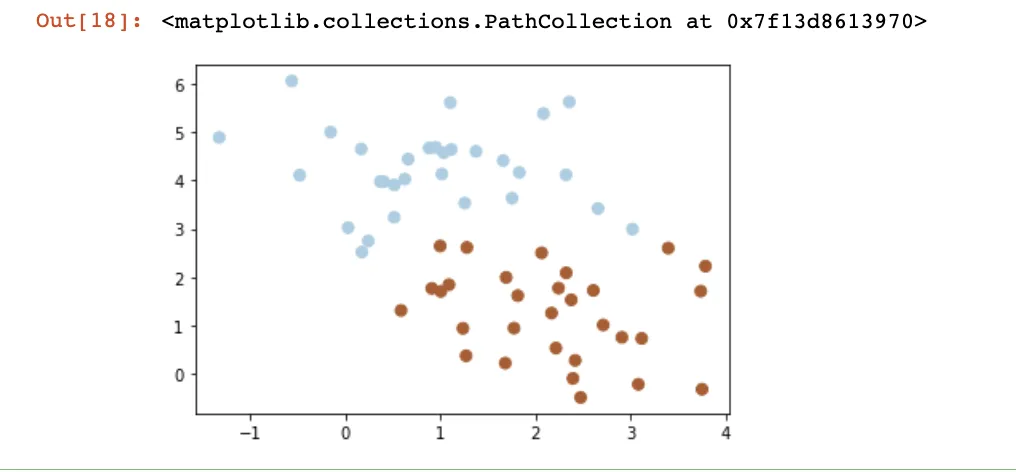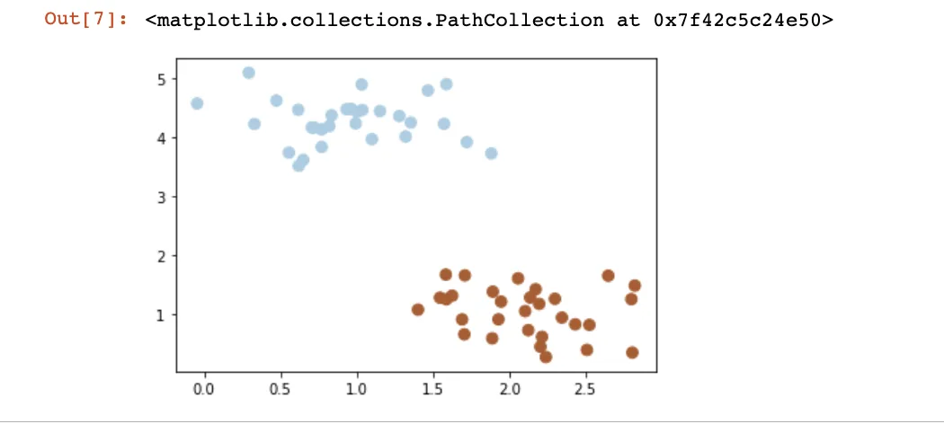 # 画散点图 X, y = make_blobs(n_samples=60, centers=2, random_state=0, cluster_std=0.9) plt.scatter(X[:, 0], X[:, 1], c=y, s=50, cmap=plt.cm.Paired)