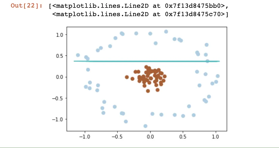 ### 遇到这种数据无法分类 from sklearn.datasets import make_circles # 画散点图 X, y = make_circles(100, factor=.1, noise=.1, random_state=2019) plt.scatter(X[:, 0], X[:, 1], c=y, s=50, cmap=plt.cm.Paired) clf = SVC(kernel='linear').fit(X, y) # 最佳函数 x_fit = np.linspace(-1.5, 1.5) w = clf.coef_[0] a = -w[0] / w[1] y_3 = a*X - (clf.intercept_[0]) / w[1] plt.plot(X, y_3, '-c')