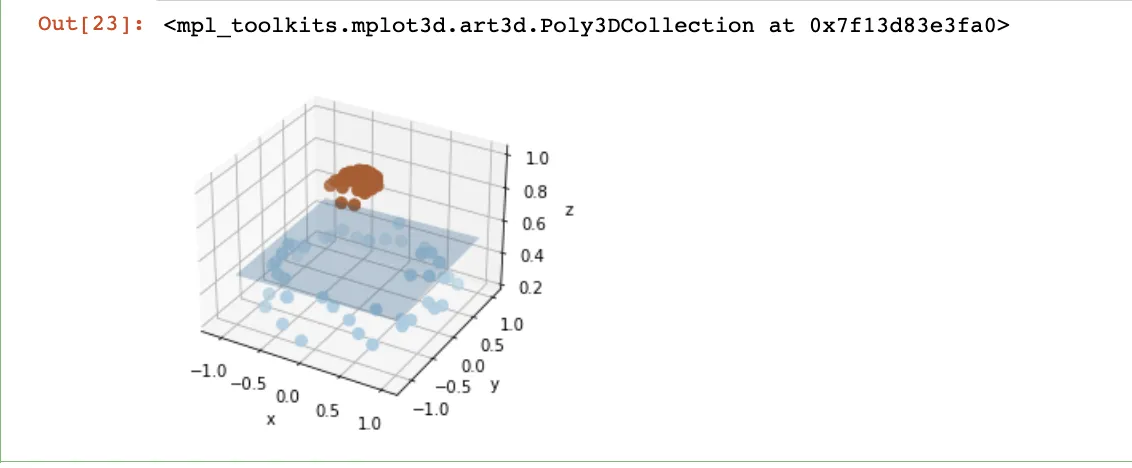 ### 将2d投放到3d超平面 # 数据映射 r = np.exp(-(X[:, 0] ** 2 + X[:, 1] ** 2)) ax = plt.subplot(projection='3d') ax.scatter3D(X[:, 0], X[:, 1], r, c=y, s=50, cmap=plt.cm.Paired) ax.set_xlabel('x') ax.set_ylabel('y') ax.set_zlabel('z') x_1, y_1 = np.meshgrid(np.linspace(-1, 1), np.linspace(-1, 1)) z = 0.01*x_1 + 0.01*y_1 + 0.5 ax.plot_surface(x_1, y_1, z, alpha=0.3)
