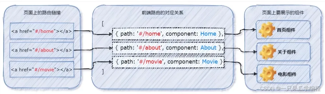 // 导入需要的组件 import Home from '@/components/Home.vue' import Movie from '@/components/Movie.vue' import About from '@/components/About.vue' // 创建路由的实例对象 const router = new VueRouter({ // routes 是一个数组,作用:定义 “hash 地址” 与 “组件” 之间的对应关系 routes: [ // 路由规则 { path: '/home', component: Home }, { path: '/movie', component: Movie }, { path: '/about', component: About } ] })