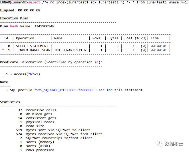 结论:虽然这个SQL的hint中指定了no index,即不使用索引,但是SQL语句仍然按照SYS_SQLPROF_015236655fb80000指定的profile使用了index。