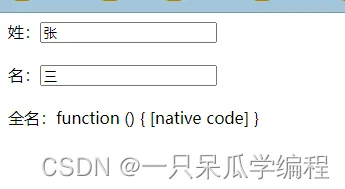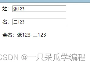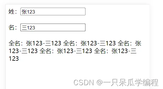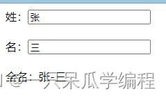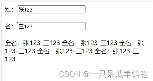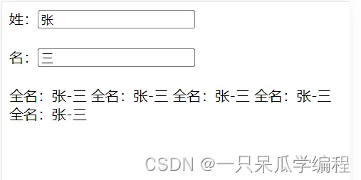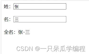 <div id="app"> 姓:<input type="text" v-model="firstName"> <br><br> 名:<input type="text" v-model="lastName"> <br><br> 全名:{{getFullName}} </div>