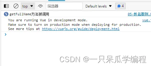 <!DOCTYPE html> <html lang="en"> <head> <meta charset="UTF-8"> <meta http-equiv="X-UA-Compatible" content="IE=edge"> <meta name="viewport" content="width=device-width, initial-scale=1.0"> <title>姓名案例</title> <script src="./js/vue.js"></script> </head> <body> <div id="app"> 姓:<input type="text" v-model="firstName"> <br><br> 名:<input type="text" v-model="lastName"> <br><br> 全名:{{getFullName()}} 全名:{{getFullName()}} 全名:{{getFullName()}} 全名:{{getFullName()}} 全名:{{getFullName()}} </div> <script> const vm = new Vue( { el: '#app', data: { firstName: '张', lastName: '三' }, methods: { getFullName() { console.log("getFullName方法被调用") return this.firstName+"-"+this.lastName } } } ) </script> </body> </html>