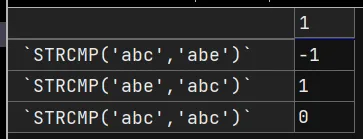 SELECT STRCMP('abc','abe'), STRCMP('abe','abc'), STRCMP('abc','abc') FROM DUAL;