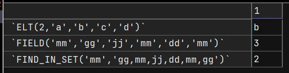 SELECT ELT(2,'a','b','c','d'), FIELD('mm','gg','jj','mm','dd','mm'), FIND_IN_SET('mm','gg,mm,jj,dd,mm,gg') FROM DUAL;