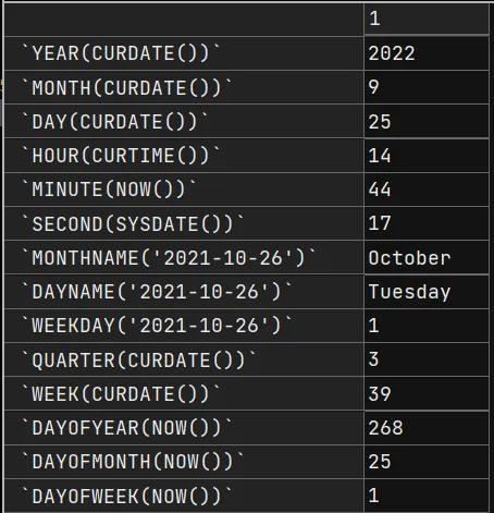 SELECT YEAR(CURDATE()), MONTH(CURDATE()), DAY(CURDATE()), HOUR(CURTIME()), MINUTE(NOW()), SECOND(SYSDATE()), MONTHNAME('2021-10-26'), DAYNAME('2021-10-26'), WEEKDAY('2021-10-26'), QUARTER(CURDATE()), WEEK(CURDATE()), DAYOFYEAR(NOW()), DAYOFMONTH(NOW()), DAYOFWEEK(NOW()) FROM DUAL;