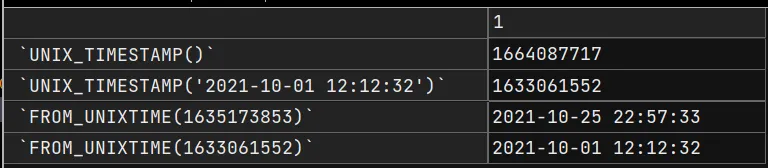 SELECT UNIX_TIMESTAMP(), UNIX_TIMESTAMP('2021-10-01 12:12:32'), FROM_UNIXTIME(1635173853), FROM_UNIXTIME(1633061552) FROM DUAL;