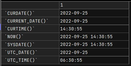 SELECT CURDATE(), CURRENT_DATE(), CURTIME(), NOW(), SYSDATE(), UTC_DATE(), UTC_TIME() FROM DUAL;