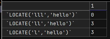 SELECT LOCATE('lll','hello'), LOCATE('ll','hello'), LOCATE('l','hello') FROM DUAL;