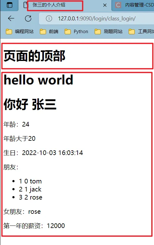 {# 继承父模板 #} {% extends "base.html" %} {# 重写页面标题区域 #} {% block title %} 张三的个人介绍 {% endblock title %} {# 重写页面的主体区域 #} {% block main %} <h1>hello world</h1> {# name 为模板等待接收的数据,需要View查询数据库传入模板 #} <h1>你好 {{ name }}</h1> <p>年龄:{{ age }}</p> <p> {% if age < 10 %} 年龄小于10 {% elif age >= 10 and age < 20 %} 年龄大于10小于20 {% else %} 年龄大于20 {% endif %} </p> {# <p>生日:{{ birthday|date:'Y-m-d H:i:s' }}</p>#} <p>朋友:</p> <ul> {# for 循环 #} {% for friend in friends %} {# forloop.counter 获取循环的次序,forloop.count0 获取下标 #} <li>{{ loop.index }} {{ loop.index0 }} {{ friend }}</li> {% endfor %} </ul> {# 获取列表中的某个元素,使用点+下标的方式进行获取 #} <p>女朋友:{{ friends.2 }}</p> {# 获取字典中的某个元素,使用点+key的形式获取 #} <p>第一年的薪资:{{ money.first }}</p> {% endblock %} {# 不需要底部区域,重写底部区域 #} {% block footer %}{% endblock %}