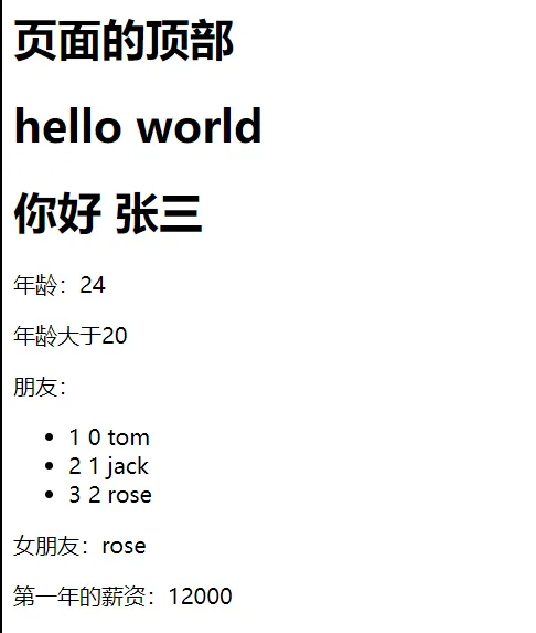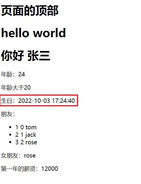 {# 继承父模板 #} {% extends "base.html" %} {# 重写页面标题区域 #} {% block title %} 张三的个人介绍 {% endblock title %} {# 重写页面的主体区域 #} {% block main %} <h1>hello world</h1> {# name 为模板等待接收的数据,需要View查询数据库传入模板 #} <h1>你好 {{ name }}</h1> <p>年龄:{{ age }}</p> <p> {% if age < 10 %} 年龄小于10 {% elif age >= 10 and age < 20 %} 年龄大于10小于20 {% else %} 年龄大于20 {% endif %} </p> <p>生日:{{ birthday|date:'Y-m-d H:i:s' }}</p> <p>朋友:</p> <ul> {# for 循环 #} {% for friend in friends %} {# forloop.counter 获取循环的次序,forloop.count0 获取下标 #} <li>{{ forloop.counter }} {{ forloop.counter0 }} {{ friend }}</li> {% endfor %} </ul> {# 获取列表中的某个元素,使用点+下标的方式进行获取 #} <p>女朋友:{{ friends.2 }}</p> {# 获取字典中的某个元素,使用点+key的形式获取 #} <p>第一年的薪资:{{ money.2019 }}</p> {% endblock %} {# 不需要底部区域,重写底部区域 #} {% block footer %}{% endblock %}