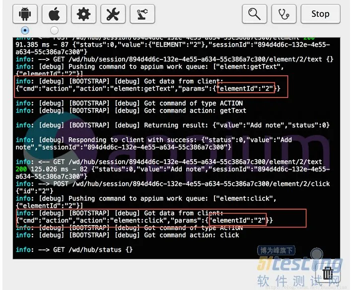 做的事情就是获得Notes这个app的菜单,然后调用控件的getText来获得‘Add note'控件的文本信息,以及通过控件的click方法来点击该控件。那么我们看下调试信息是怎样的: