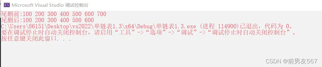 int main() { SlistNode* plist = NULL; SListpushback(&plist, 100); SListpushback(&plist, 200); SListpushback(&plist, 300); SListpushback(&plist, 400); SListpushback(&plist, 500); SListpushback(&plist, 600); SListpushback(&plist, 700); printf("尾删前:"); SlistPrintf(plist); printf("\n"); printf("尾删后:"); SListpophback(&plist); SlistPrintf(plist); return 0; }