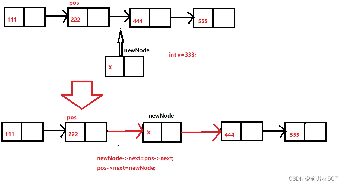 在pos位之后,增加一个结点,首先我们结合查询函数,获得你想插入链表中的一个中间位置的地址,这个位置地址就是pos,我们申请一个新的结点(newNode),先将pos后一个结点的地址(pos->next)给新结点的next,再将新结点的地址给pos->next。这样新增加的结点就和我们的链表连接起来了。这里的先后顺序是不能变的,因为如果pos->next=newNode;后面也就找不到pos后面的一个结点。