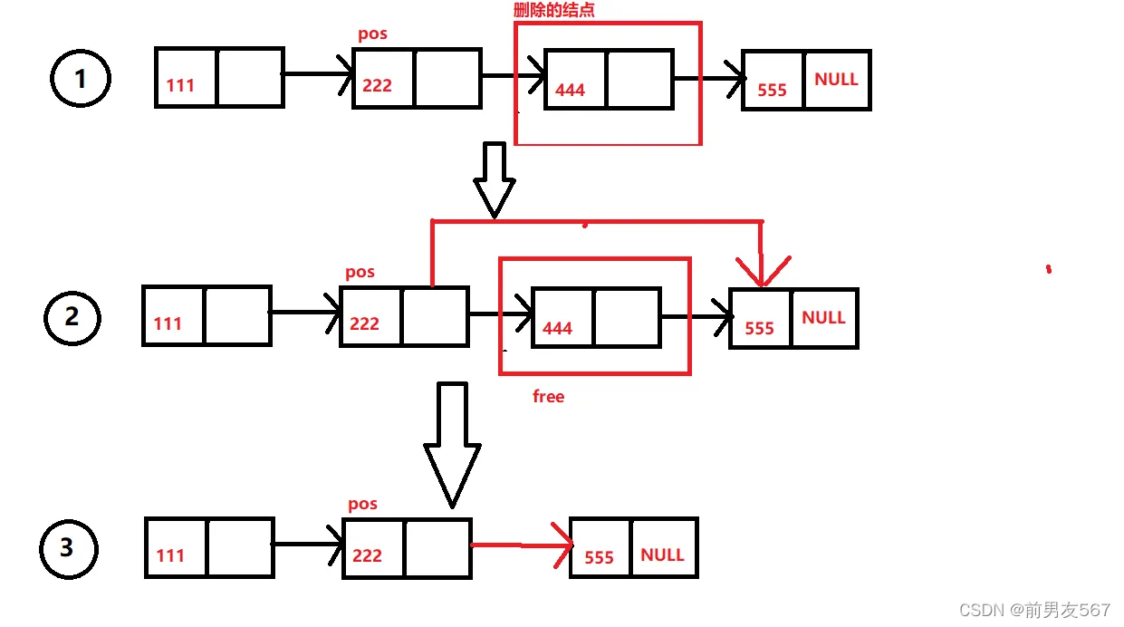 首先先保存一下,被删除结点的地址,在将pos的next指向被删除后面的结点的地址,最后释放掉被删除结点的空间,并将指针置空。
