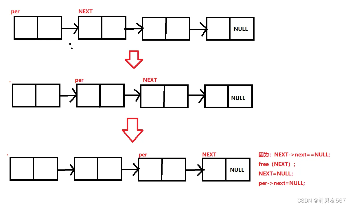 删除链表尾部的一个结点,其实很简单,我们只要找到最后一个结点,并且把它用free(),释放掉,再把倒数第二个结点的next置空。因为最后一个结点没有了以后,倒数第一个结点就是最后一个结点了。 但是有一个点需要注意,就是当我们找到最后一个结点的时候,就回不到倒数第二个结点里面的next,也就没办法给他置空了,所以为了能够在找到倒数第一个结点的时候还能找到倒数第二个,我们可以定义一前一后两个指针,后面的指针指到倒数第一个结点的时候,前面的指针就可以指向倒数第二个指针了。