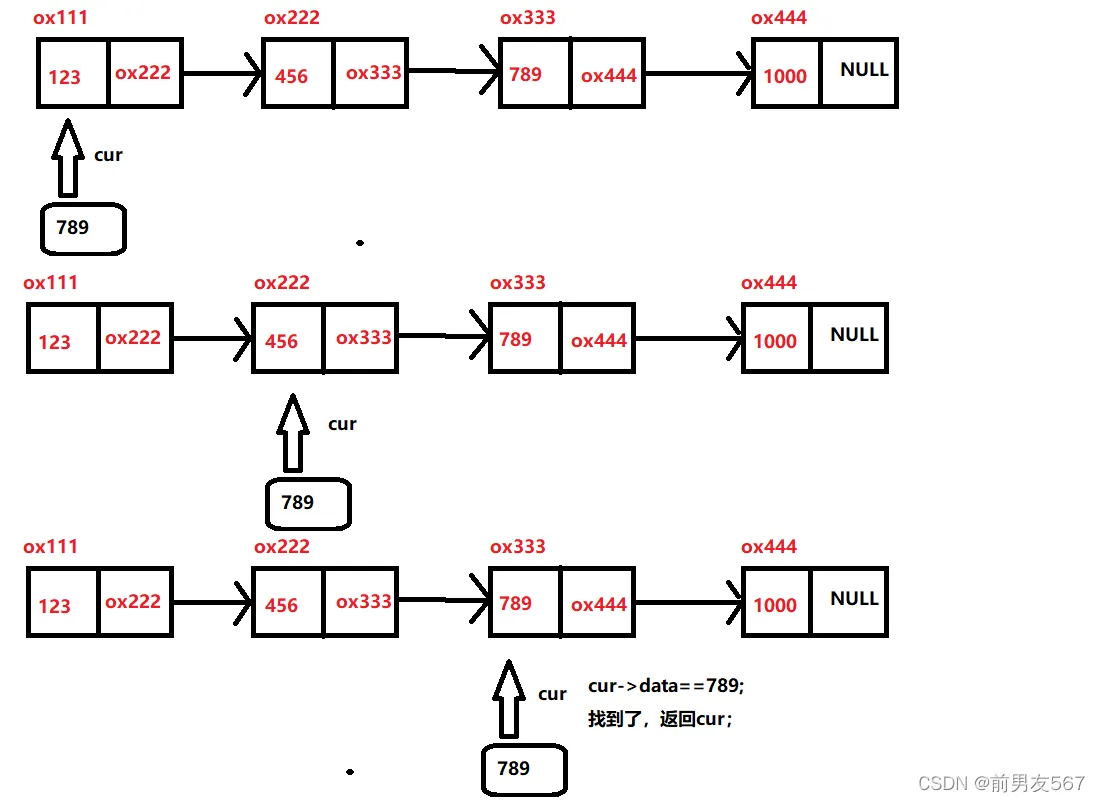 SlistNode* FindList(SlistNode* phead, SListdataType x)//查找一个结点; { SlistNode* cur = phead; while (cur != NULL) { if ((cur->data) == x)//如果相等,就找到了,返回cur; { return cur; } else { cur = cur->next;//不相等就往后走,判断下一个; } } return NULL;//走到这里,链表都遍历完了,就是没找到,返回NULL; }
