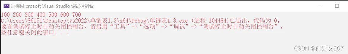 int main() { SlistNode* plist = NULL; SListpushback(&plist, 100); SListpushback(&plist, 200); SListpushback(&plist, 300); SListpushback(&plist, 400); SListpushback(&plist, 500); SListpushback(&plist, 600); SListpushback(&plist, 700); printf("插入前:"); SlistPrintf(plist); printf("\n"); SlistNode* pos= FindList(plist, 300); SlistInserAfter(&pos, 350); printf("插入后:"); SlistPrintf(plist); SlistEraseAfter(&pos); printf("\n"); printf("删除后:"); SlistPrintf(plist); return 0; }