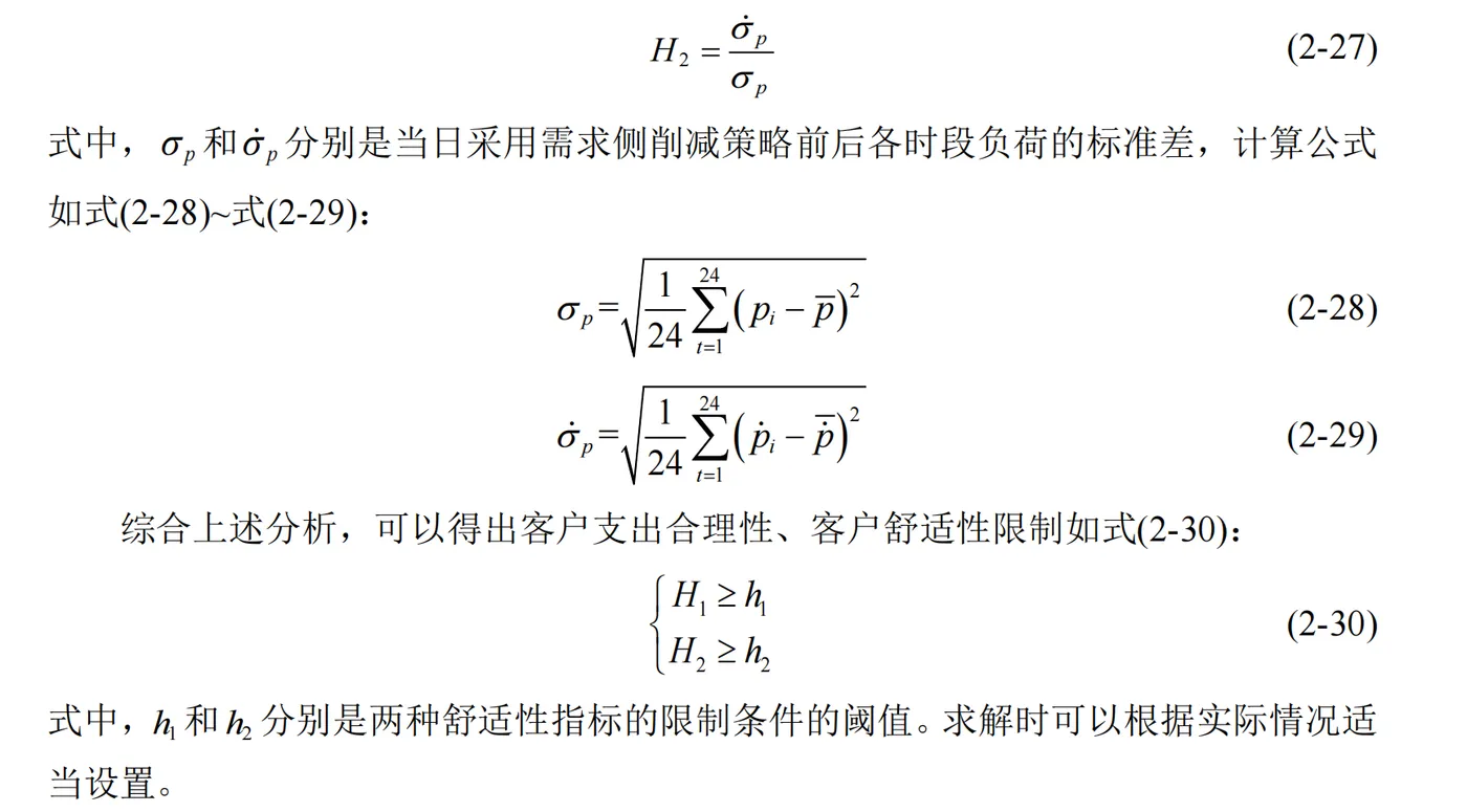 通过上述分析可知,负荷曲线的标准差可以从一定程度上体现客户对于需求侧响应的参与度。随着参与度的提升,负荷曲线的标准差也会在一定程度上减小,但是客户被迫调整或者削减原有的用电安排的情况就会越多,导致舒适性降低。基于上述分析,定义客户舒适性指标 H2如式(2-27):