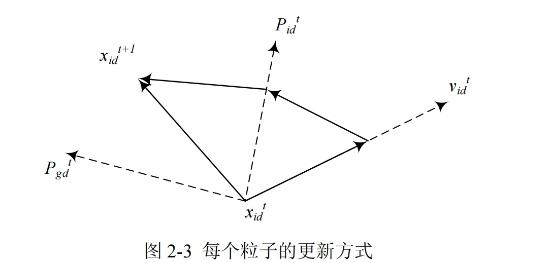 PSO 算法中,每个规划目标的隐含解都是搜寻空间内的一枚粒子。所有粒子都存在由优化函数决定的适值,同时每个粒子还有一个速度决定它们“飞行”的方向和距离,全部粒子通过实时跟踪最优粒子在解空间中不断进行迭代。粒子的更新方式如图2-3 所示: