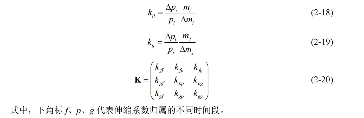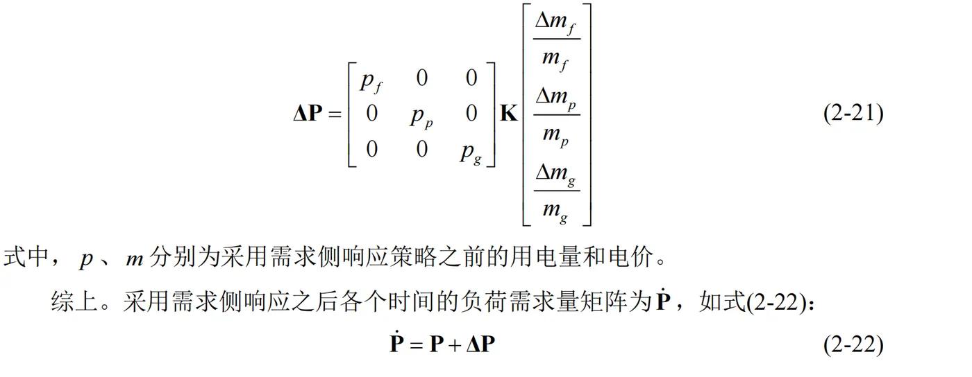 显然地,K 矩阵对角线元素k ff 、 k pp 、kgg 表征了当前时间电价变化与需求侧用电量之间的相互作用,是自伸缩系数;而矩阵中其他元素则表征了不同时间内电价变化与需求侧用电量的相互作用,是互伸缩系数。进一步地,在采用了分时电价之后,各个时间段用电变化量ΔP ,如式(221):