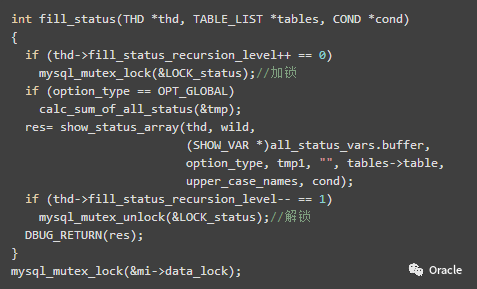 另外其一个会话发起show global status,执行的时候首先锁定LOCK_status锁,由于show status包括,Slave_heartbeat_period,Slave_open_temp_tables,Slave_received_heartbeats ,Slave_retried_transactions这些状态,于是还需要LOCK_active_mi锁,于是,这个会话也会被阻塞掉。