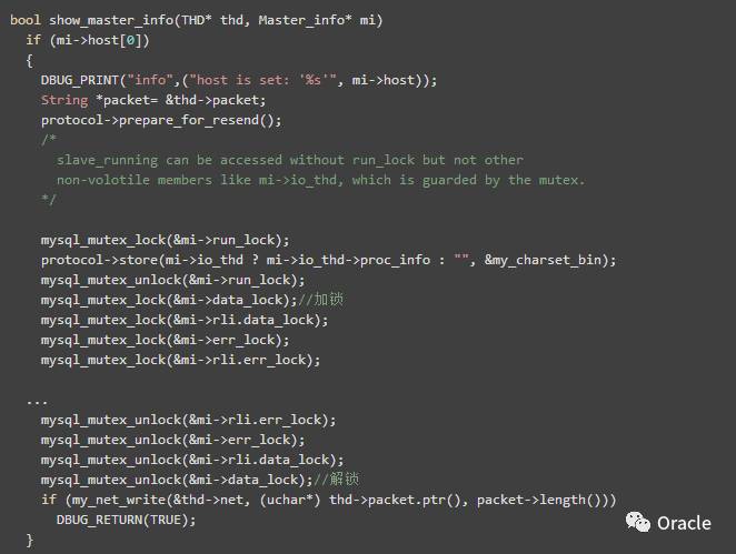 当发起一个show slave status请求的时候,执行的时候,会首先锁住LOCK_active_mi锁,然后锁定mi->data_lock锁,当然,现在的情况下,mi->data_lock不会得到,于是LOCK_active_mi锁就会被该线程持续持有。