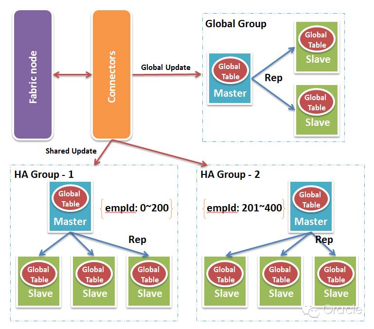 真实的环境中,并非所有的表都需要拆分,因此 Fabric 还会创建一个全局组 (Global Group),里面存放所有全局表 (Global Table),而每个分片都将会存放全局表的副本,这样做的好处就是方便了拆分表和非拆分表的 JOIN 操作。如果应用对全局表进行更新,连接器将会把请求发到全局组,全局组又将自己的变化同步到各个 HA Group。