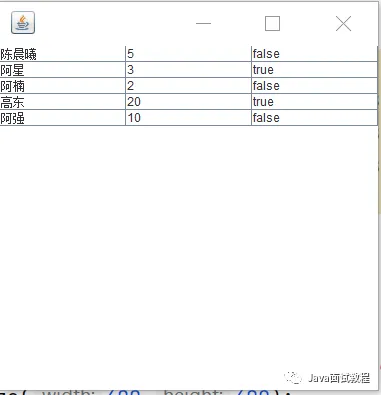 import javax.swing.*; import javax.swing.table.*; import java.awt.*; class Table{ public static void main(String args[]){ JFrame frame = new JFrame(); String[] columnNames = {"姓名", "年龄", "是否学生"}; Object[][] data = { {"陈晨曦", new Integer(5), new Boolean(false)}, {"阿星", new Integer(3), new Boolean(true)}, {"阿楠", new Integer(2), new Boolean(false)}, {"高东",new Integer(20), new Boolean(true)}, {"阿强", new Integer(10), new Boolean(false)} }; JTable table = new JTable(data, columnNames); frame.add(table); frame.setDefaultCloseOperation(JFrame.EXIT_ON_CLOSE); frame.setSize(400,400); frame.setLocationRelativeTo(null); frame.setVisible(true); } }