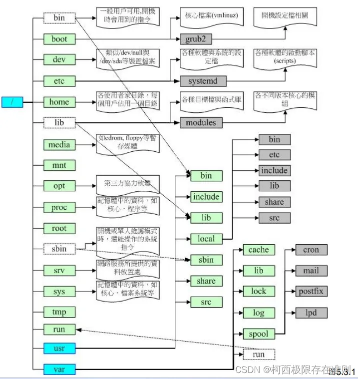 如果我们将整个目录树以图示的方法来显示,并且将较为重要的文件数据列出来的话,那么目录树架构有点像这样: