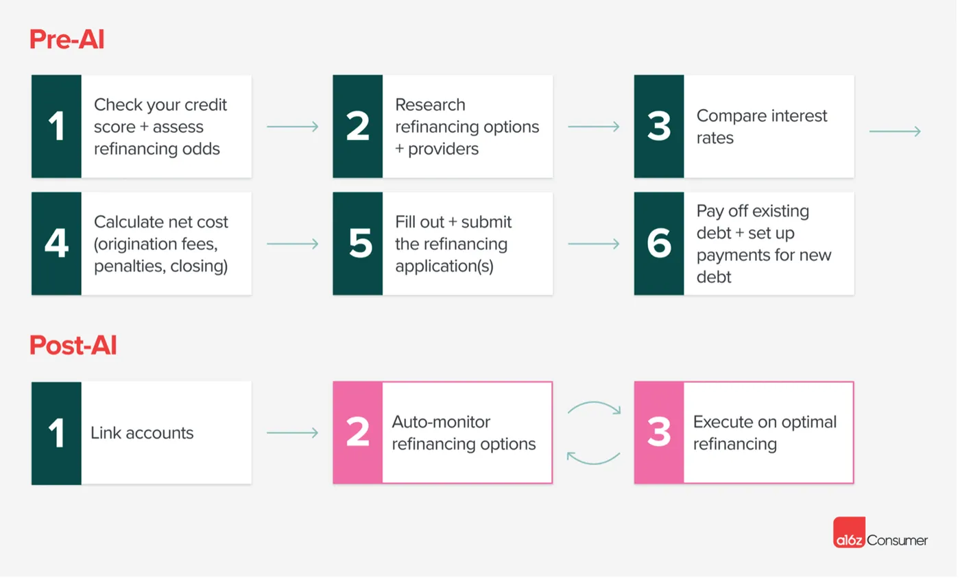 - 文章还预测「再融资机器人 (Refi Robots)」的出现,可以利用生成AI分析用户当前债务情况,并自动找到最优再融资方案。这将极大影响现有债权方的利益。