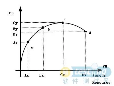 b点到d点的系统性能,表示在超过安全负载的条件下,不断对系统进行加压,直到系统不能再接受请求,并可以确定一个系统瓶颈的情况下,目的是为了找出系统的瓶颈,需要对系统进行调优。