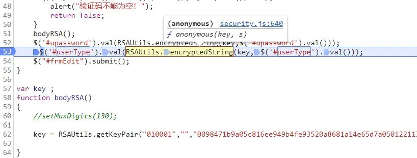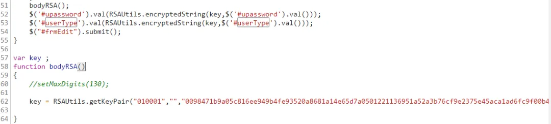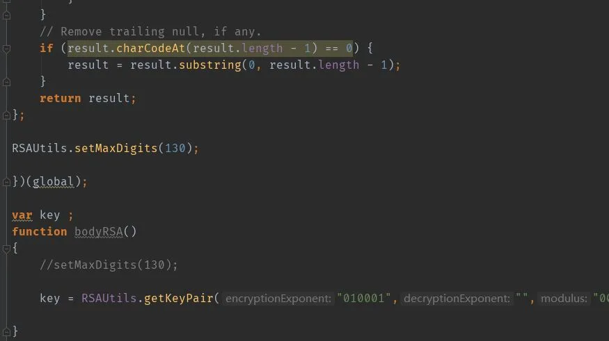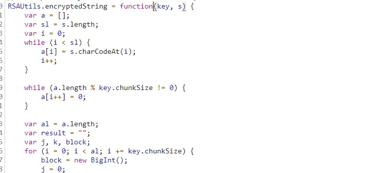 点击该函数进入,可以发现 RSAUtils 的定义及其相应的函数都在这个 JS 文件中,直接一把梭,将该文件中的 JS 代码全部复制下来吧: